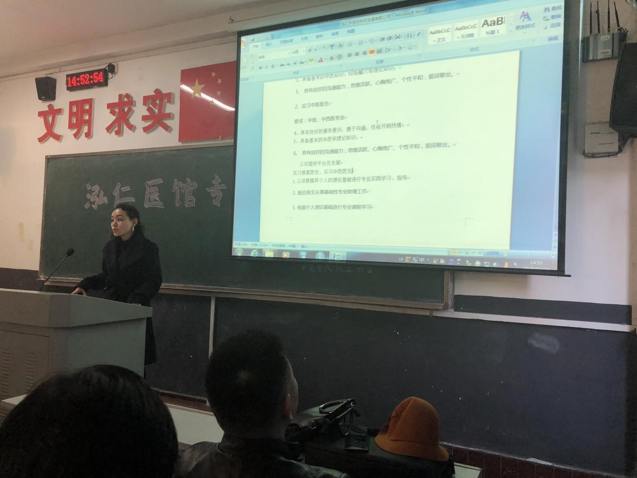 招聘会上,泓仁医馆招聘人员首先向在座应届毕业生播放公司宣传视频,向同学们介绍其平台愿景是成就世界一流创新中医药事业;平台使命为:泓扬国医,仁爱大众;平台价值观为:感恩诚信,睿智担当,激情喜悦,创新成就。接下来公司介绍了招聘的职位与要求,招聘职位包括实习推拿医生、实习中医医生、收货员、养护员与诊所运营服务专员若干,并说明录取后公司提供的条件与福利。最后,应届毕业生积极提出相关问题,招聘方负责人予以明确回答并为在场学生提出实用性建议。