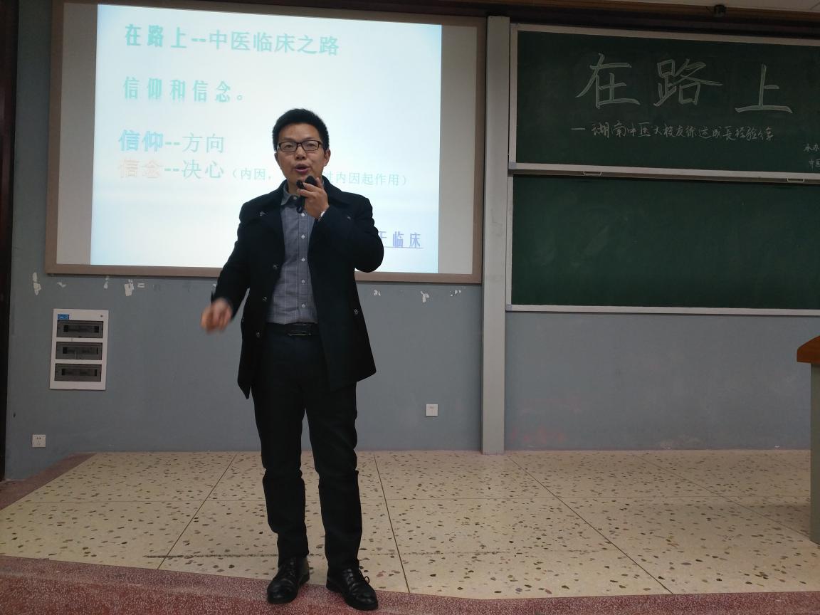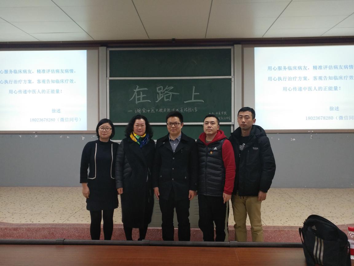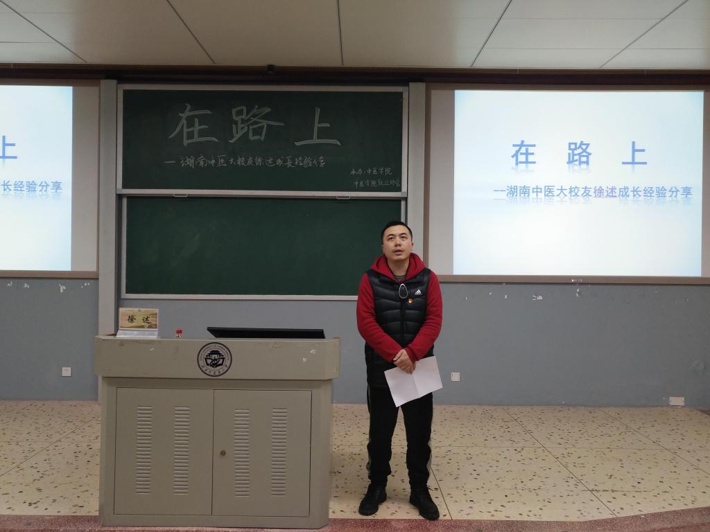 2018年12月7日晚上7:00,中医学院组织举办了主题为“在路上——湖南中医药大学校友徐述成长经验分享”的专题讲座。主讲人为我校优秀校友徐述。徐述是湖南中医药大学2009届针灸推拿专业硕士毕业生,现任韶关市铁路医院康复科主任。