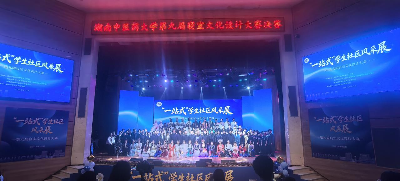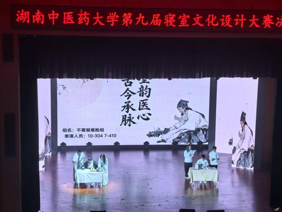 2025年12月22日晚,湖南中医药大学“一站式”学生社区风采展——第九届寝室文化大赛总决赛在大学生活动中心圆满落下帷幕。我院2025级中医专业学生组成的“不畏艰难险组”,凭借《墨韵医心·古今承脉》主题展示,作品深度融合中医精神与书法艺术,并结合场景化演绎,在决赛中荣获二等奖。